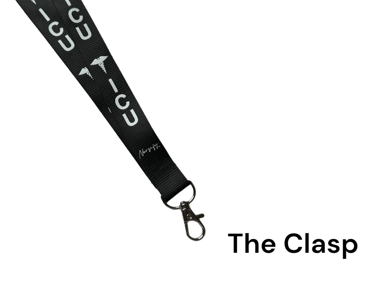 This lanyard comes with a metal clasp at the bottom to hold identification, hospital cards, educational nursing cards, etc. It has 2 breakaways for safety. With multiple "ICU" signs all over the lanyard, others at your place of work know which unit you work on and that you are proud to work in critical care!