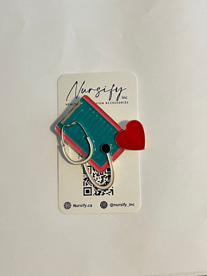 This clipboard stethoscope pin is a cute accessory to put on your scrubs, work uniform, or your work bag. The stethoscope is white and gold, the clipboard is pink and teal, and there's a red heart!