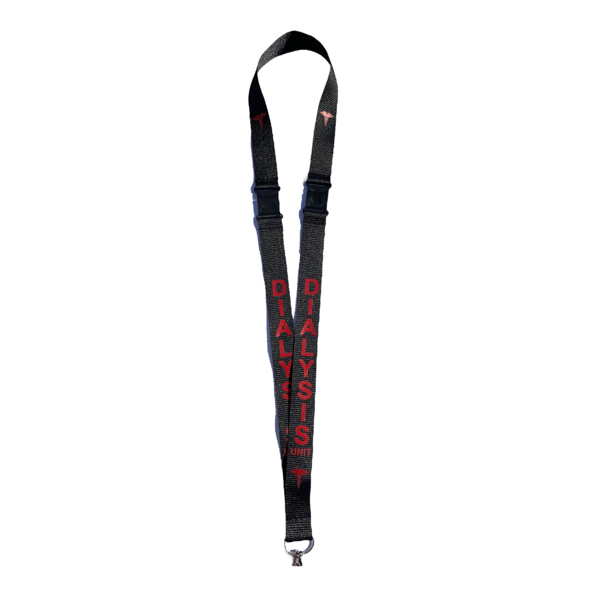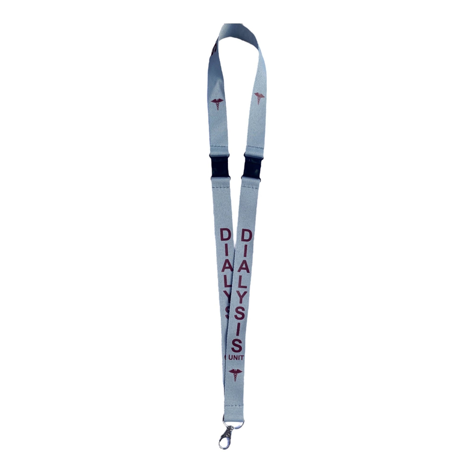 This lanyard comes with a metal clasp at the bottom to hold identification, hospital cards, educational nursing cards, etc. It has 2 breakaways for safety. It has "DIALYSIS UNIT" written on it so other can clearly identify your position and you can show you are proud to work where you do!