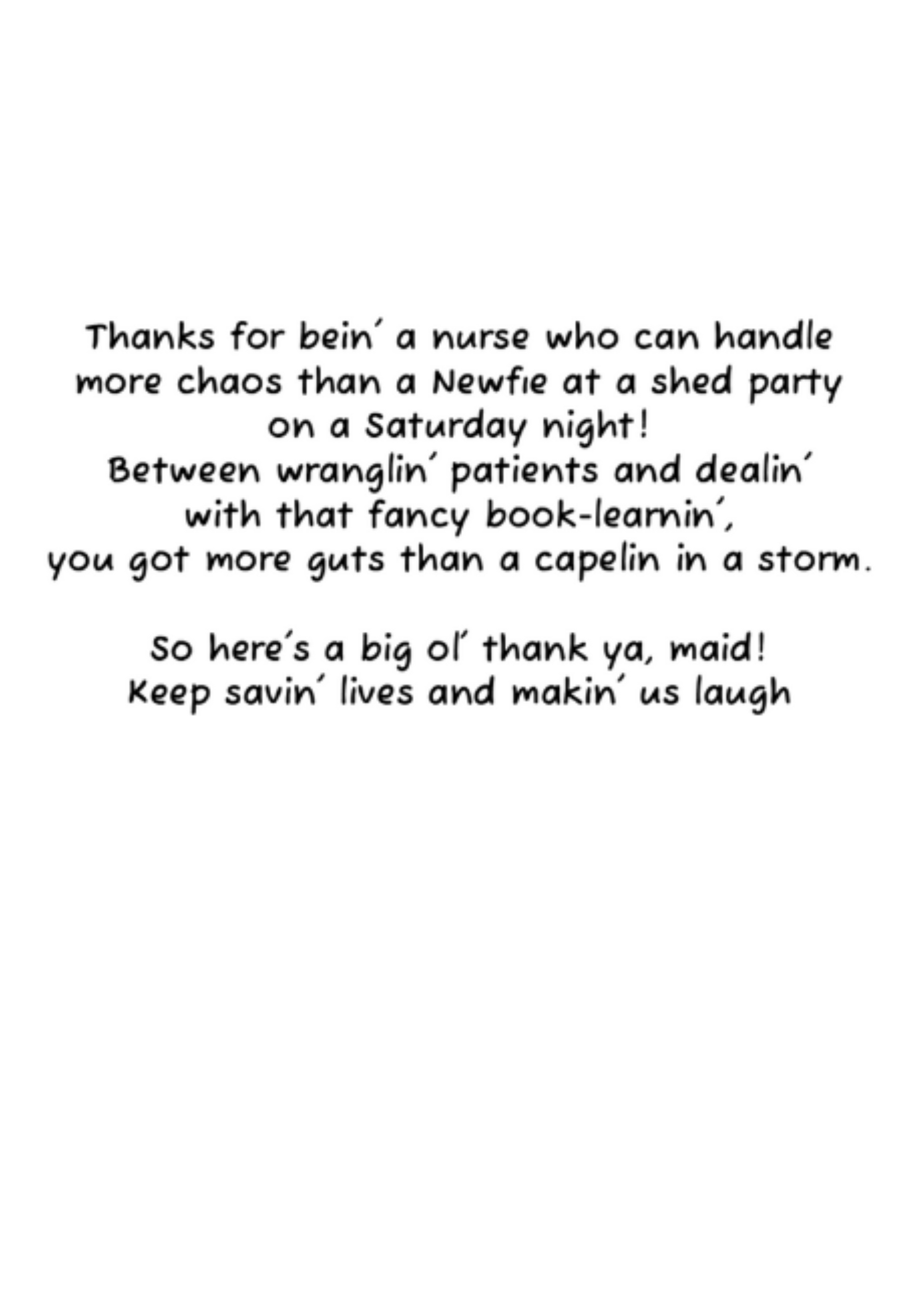 This is a very funny, nurse appreciation card for a nurse from Newfoundland. I checked in with a few nurses from newfoundland and they said it was perfect.