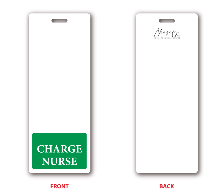 This longer CHARGE NURSE badge buddy is made of durable plastic and features white text on a green background. It's vertical and measures 54mm by 139mm, designed to fit IDs in plastic cases. It's a stylish accessory to match with your work outfits and allows others to easily identify your position. Show your pride with this badge buddy!