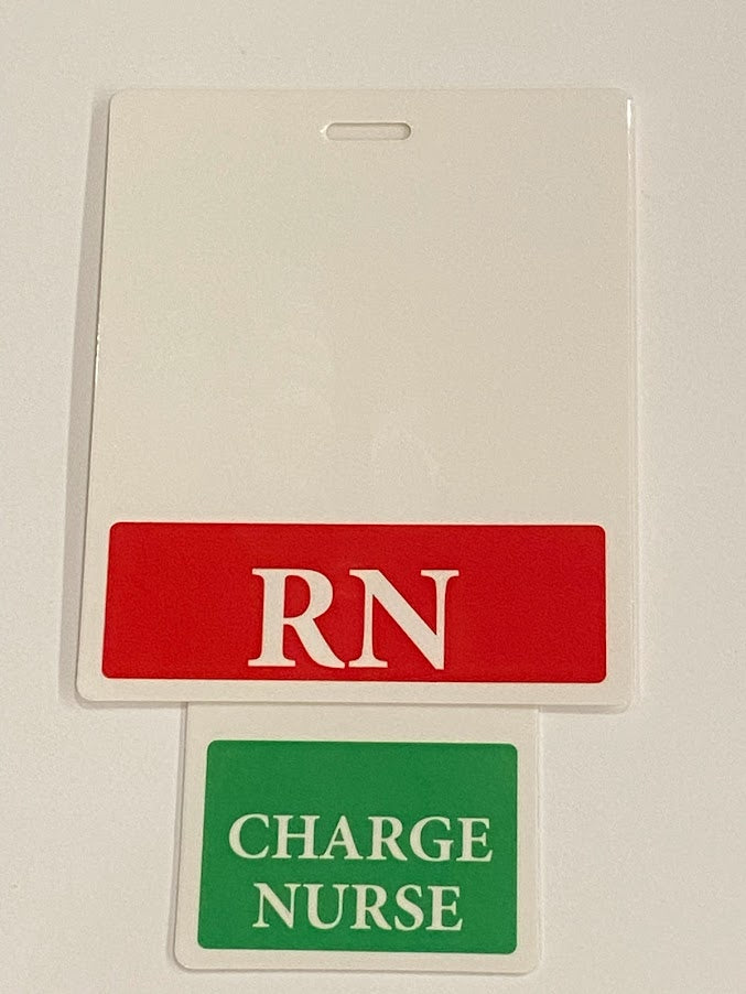 CHARGE NURSE badge buddy comes in green, green (long), orange, and orange (long).