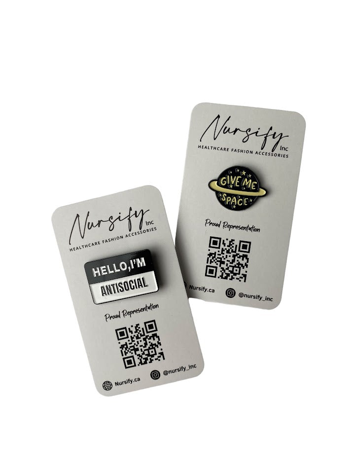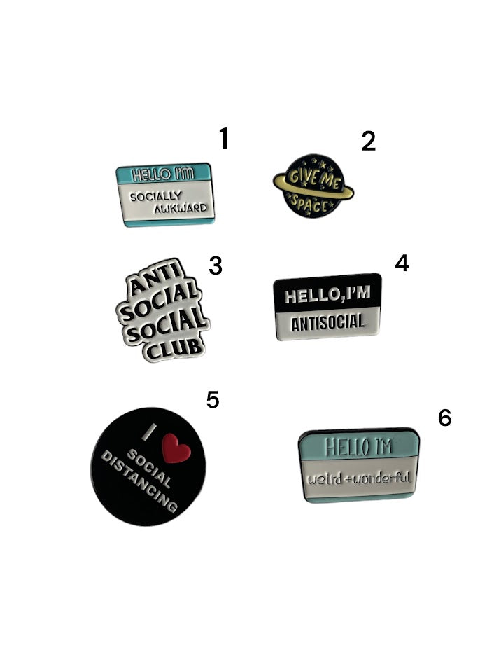 These pins are great for those who are not the biggest fan of people and who are more introverted. Let others around you know your preferences about talking to and being around others. Choose from our 6 options (numbered in a picture).