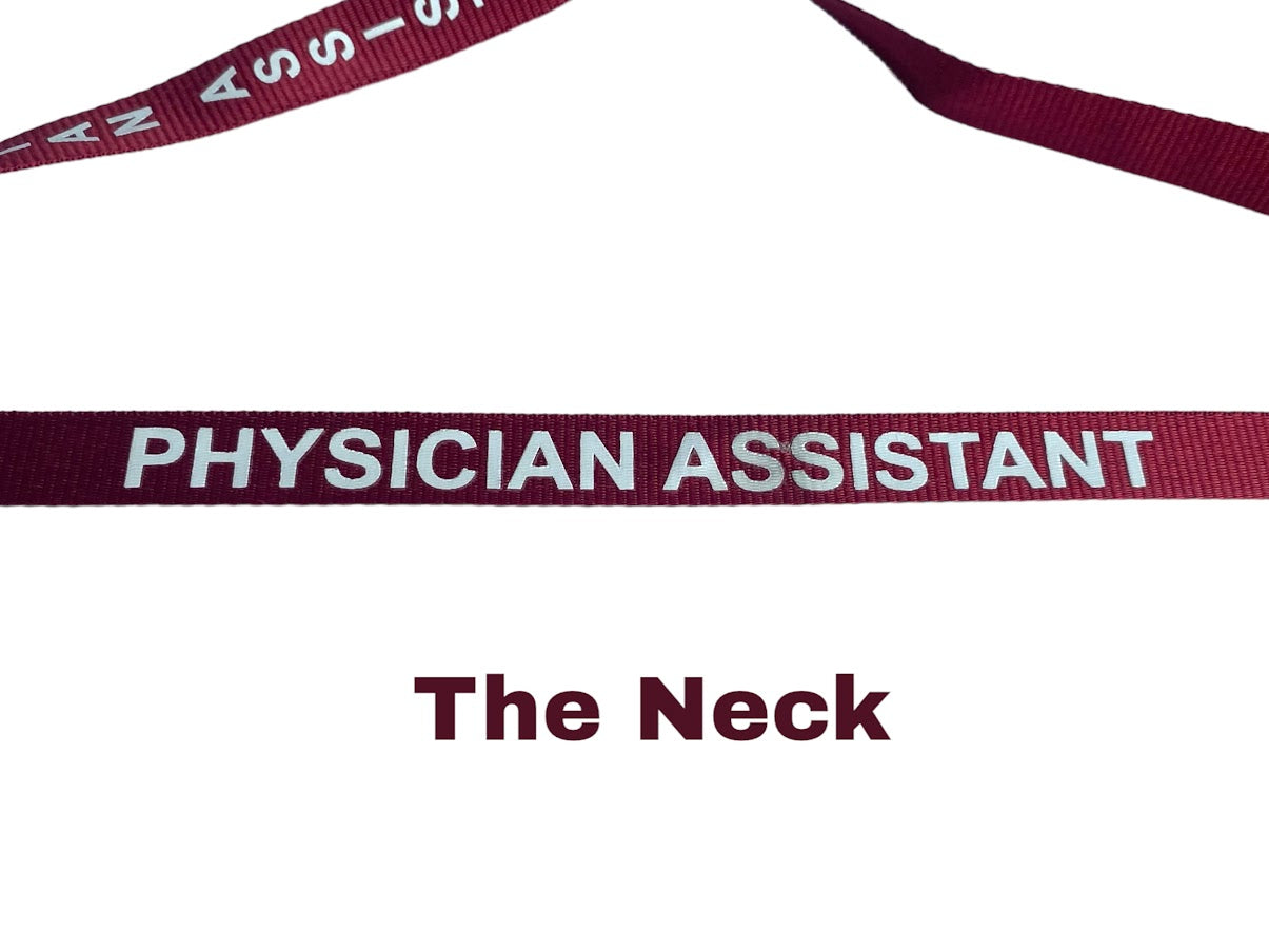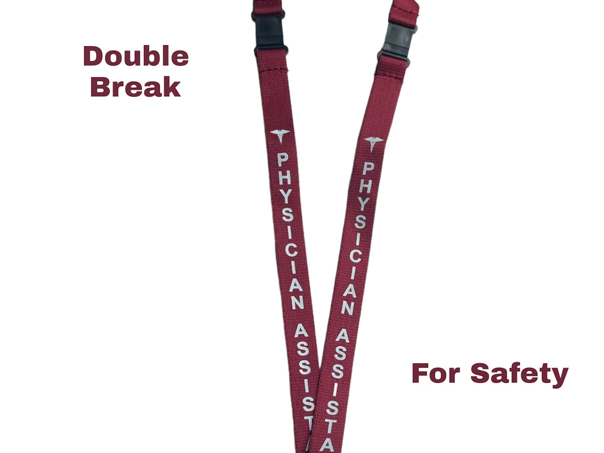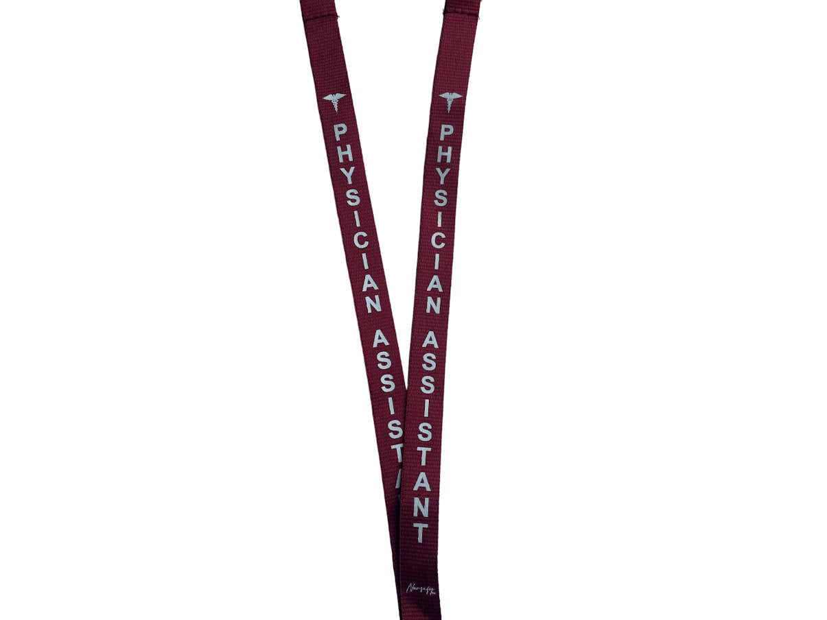 Elevate your professional image with our premium Physician Assistant lanyard featuring 2 breakaways for enhanced safety. This high-quality lanyard comes with a 6-month warranty and a stylish 37mm button. Crafted from durable burgundy polyester, it boasts a thickness of 15mm and a length of 900mm. The white screen-printed lettering adds a professional touch, while the lanyard hangs flawlessly as showcased in the pictures.