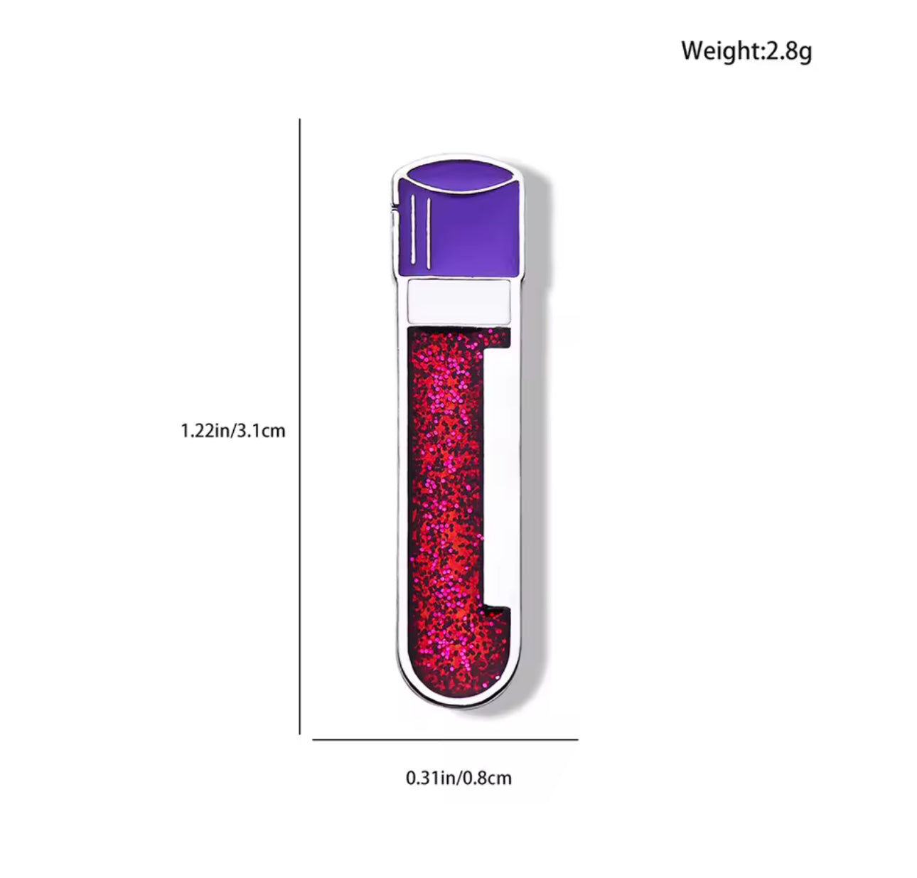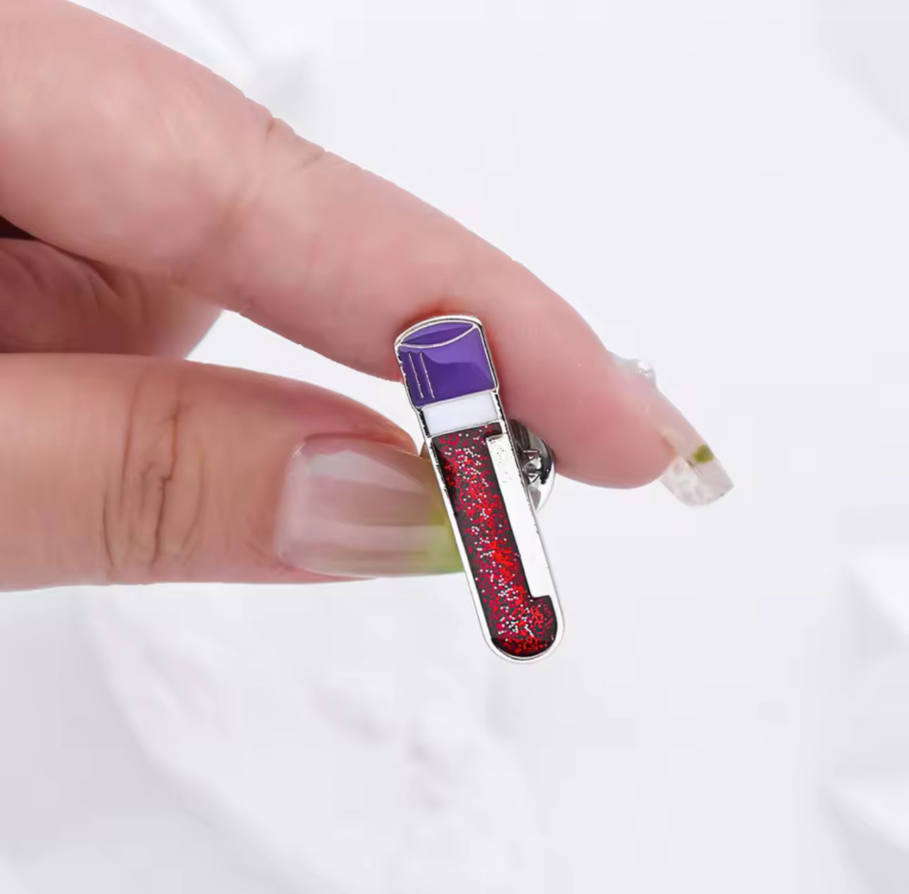 - Test Tube Pin β Vertical glitter-filled red test tube with a purple cap. A simple but eye-catching lab favorite.