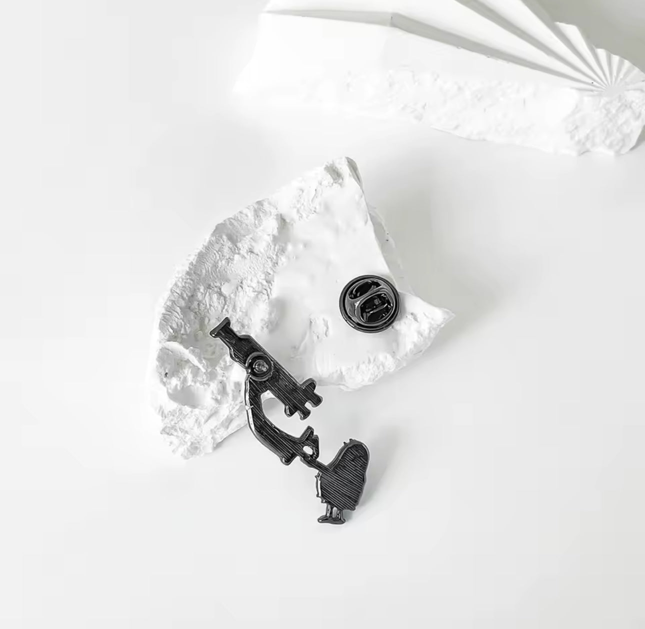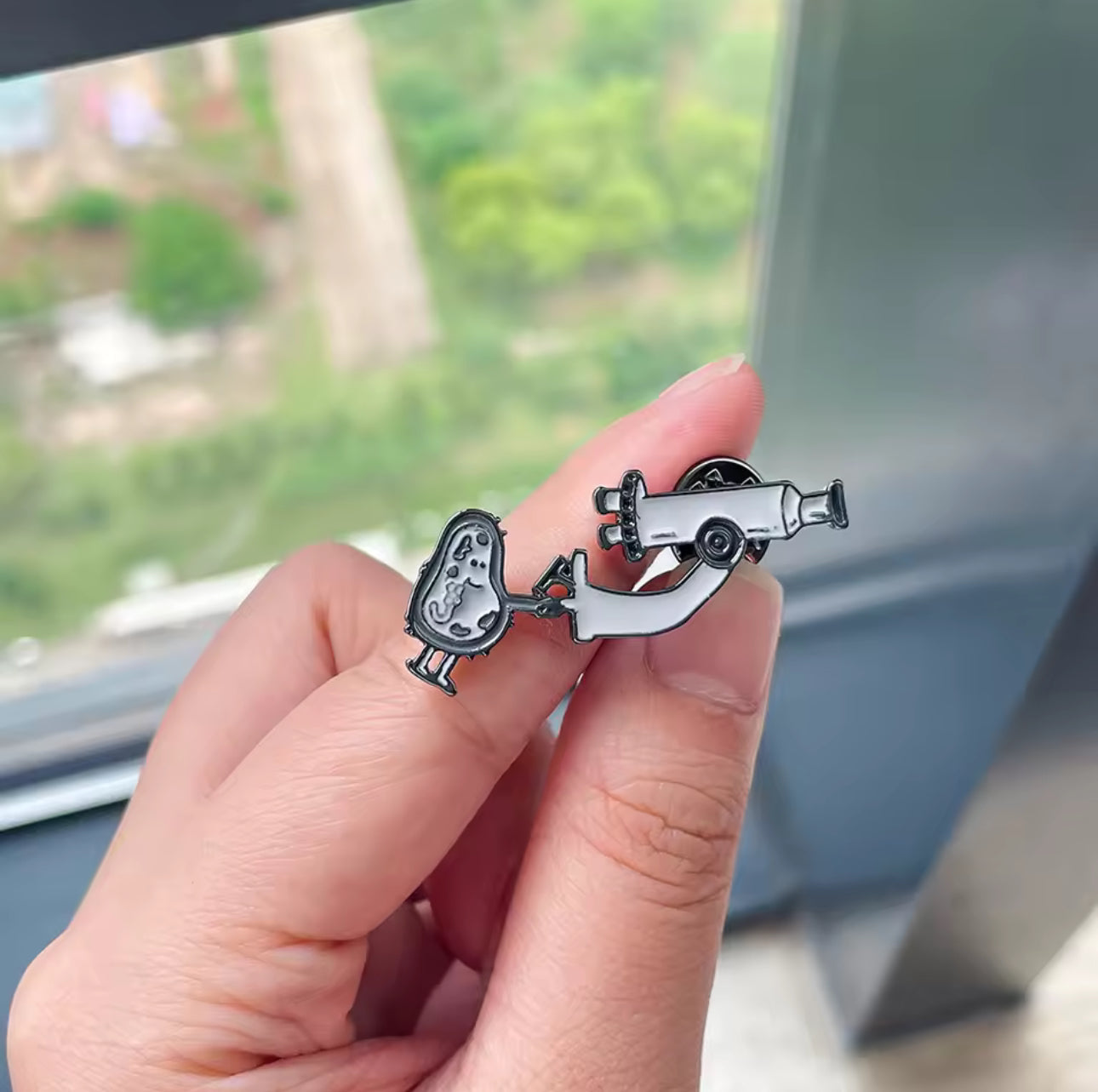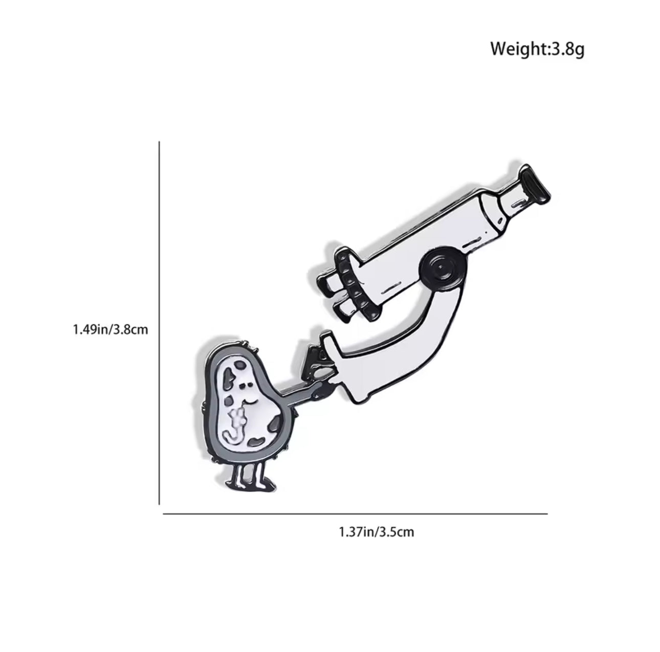- Germ & Microscope Pin β A black-and-white enamel design showing a microscope examining a smiling germ cell.