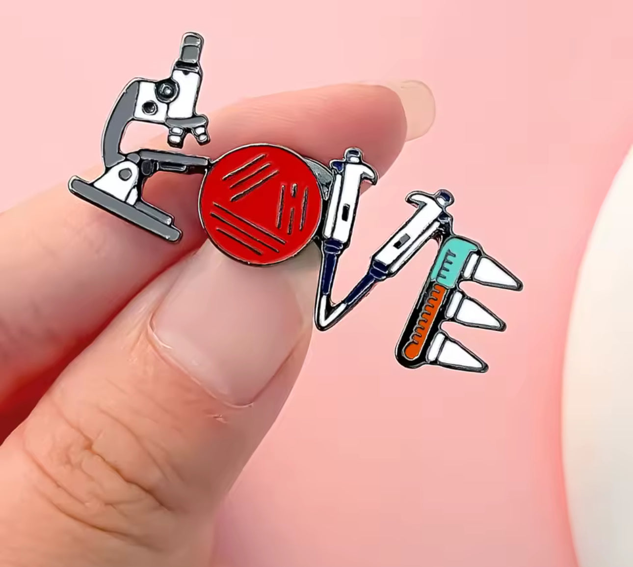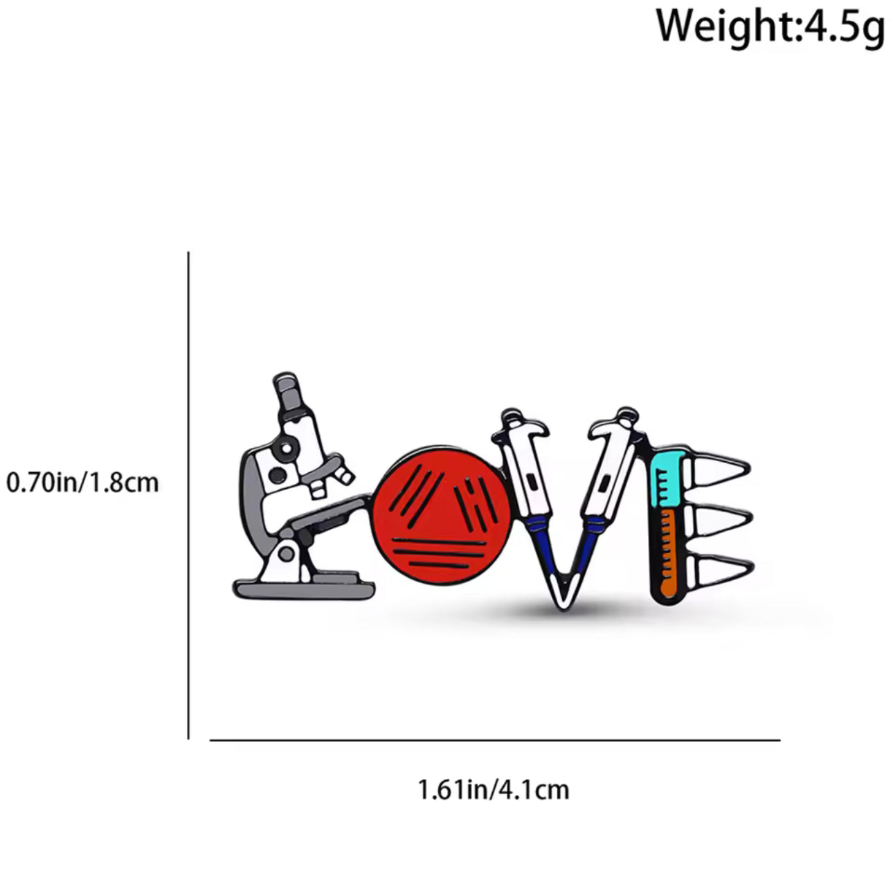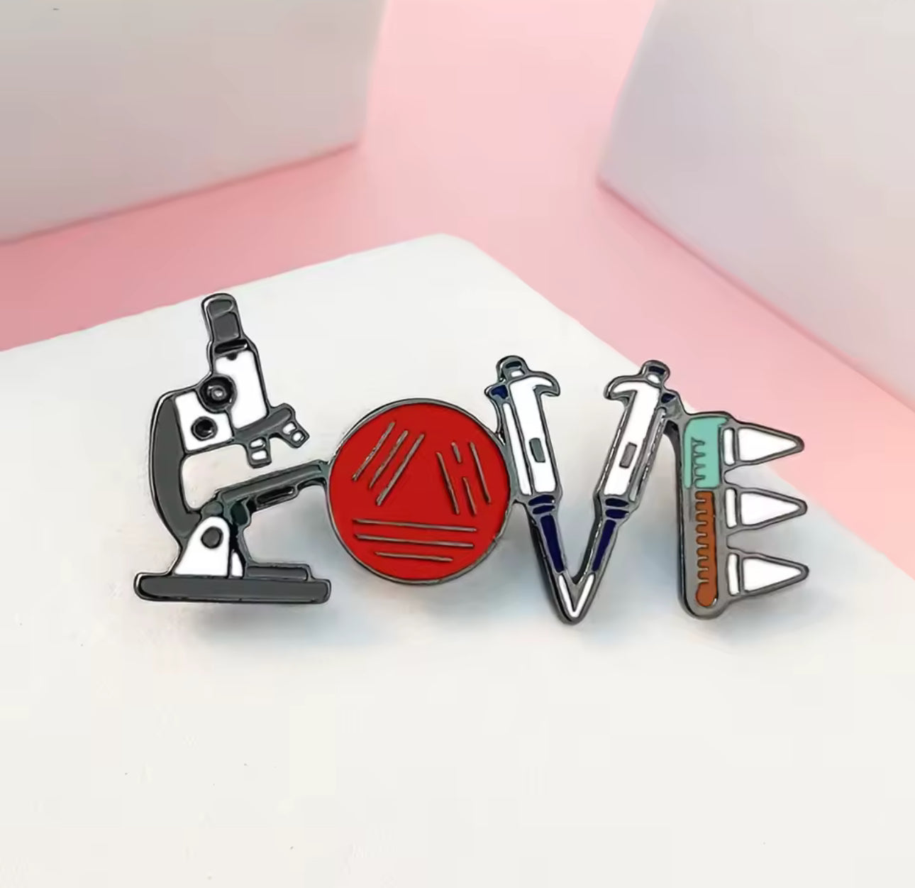 - LOVE Lab Pin β Spells βLOVEβ using lab items: microscope, petri dish, pipette, and test tubes. A fun STEM twist!